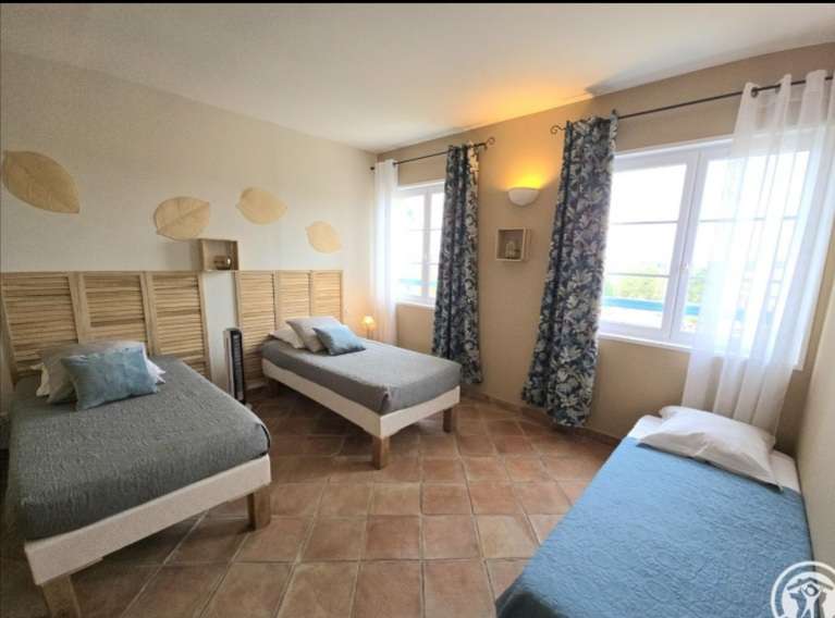 - La chambre principale avec terrasse est équipée d’un lit de 160 cm, attenante à une chambre avec 3 lits 90 cm.