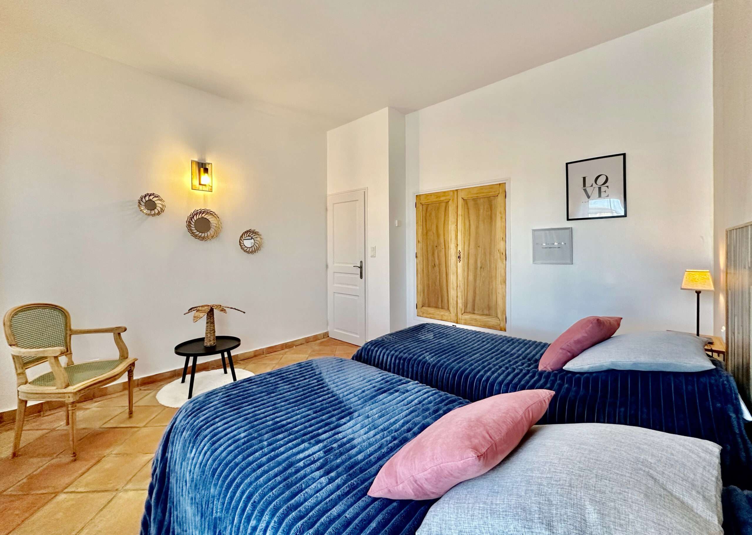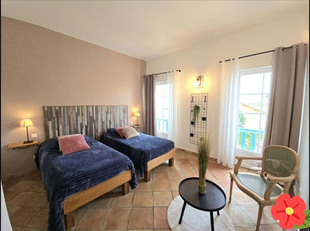 - La chambre principale avec terrasse est équipée d’un lit de 160 cm, attenante à une chambre avec 2 lits 90 cm.